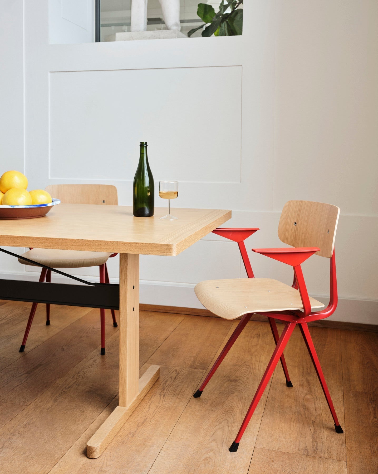 リザルト アームチェアは、オリジナルのリザルト チェアと同じ薄い鋼板のベース、オーク材の座面と背もたれを備えていますが、高さのあるアームレストがデザインにさらなる快適さと機能性をもたらしています。1950 年代にアーレンドで働いていたフリソ クレイマーとヴィム リートフェルトによって最初に作られました。