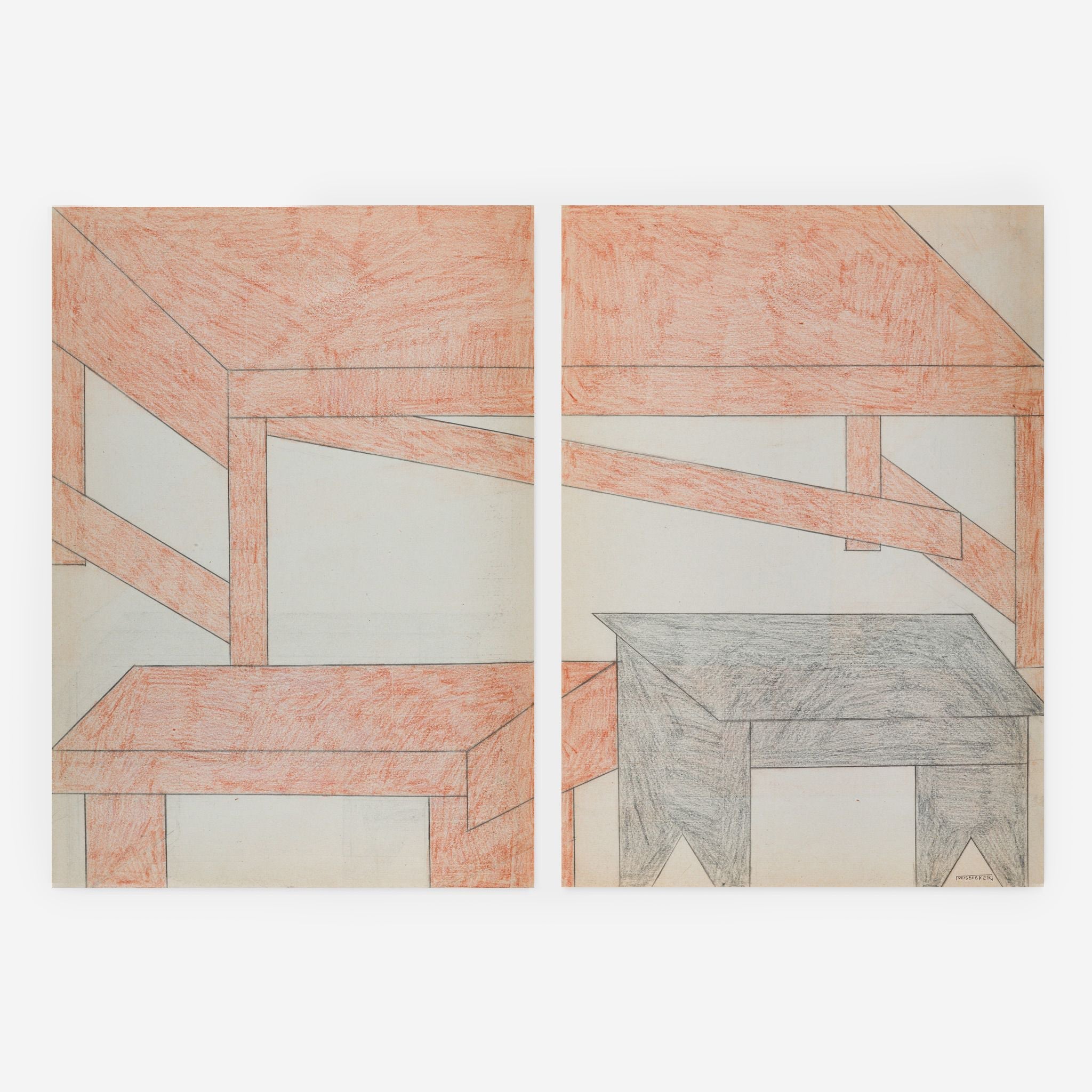フィリップのアディロンダックシリーズは、椅子、テーブル、チェストを描いており、具象と抽象が混ざり合った構造的な構成になっています。ニューヨークでアーティストに贈られたアディロンダックの家具の本からインスピレーションを得ています。