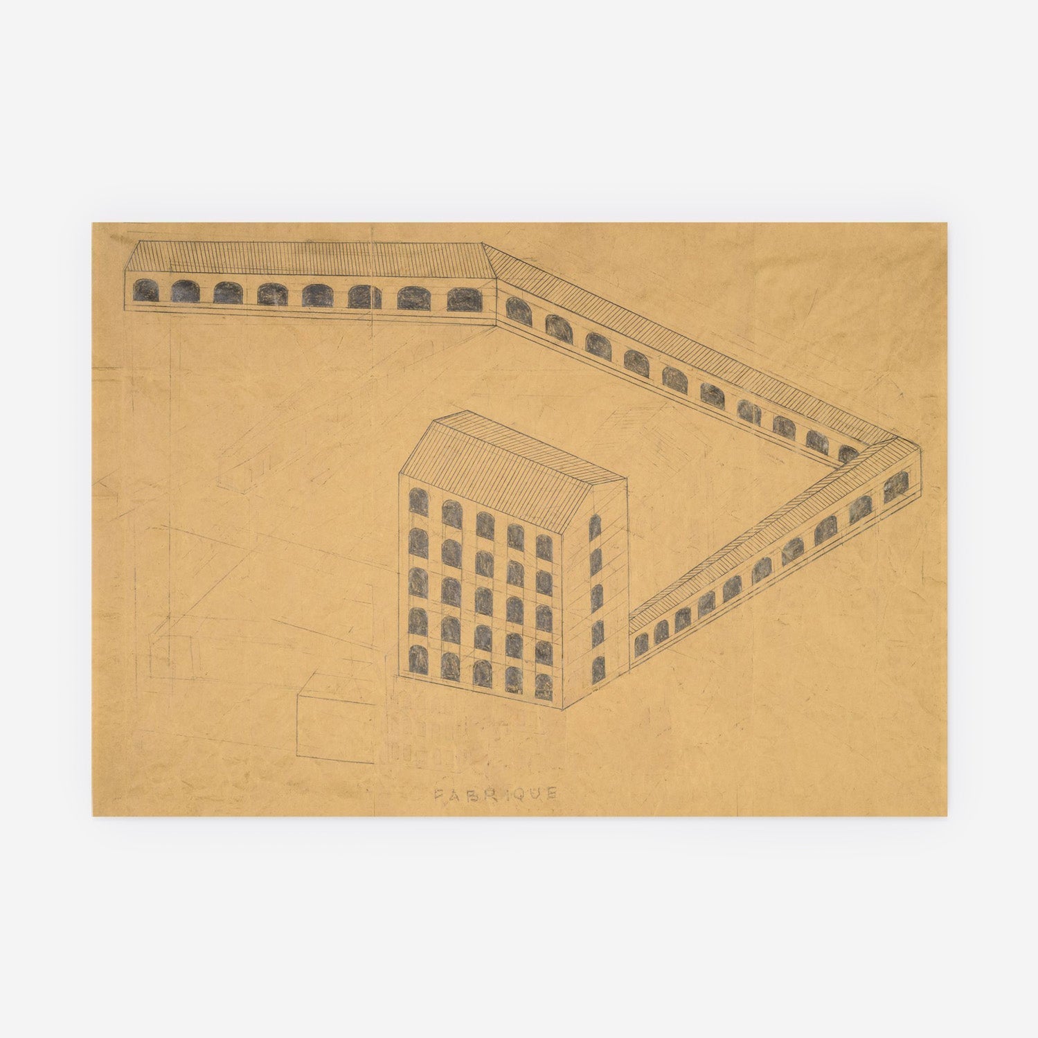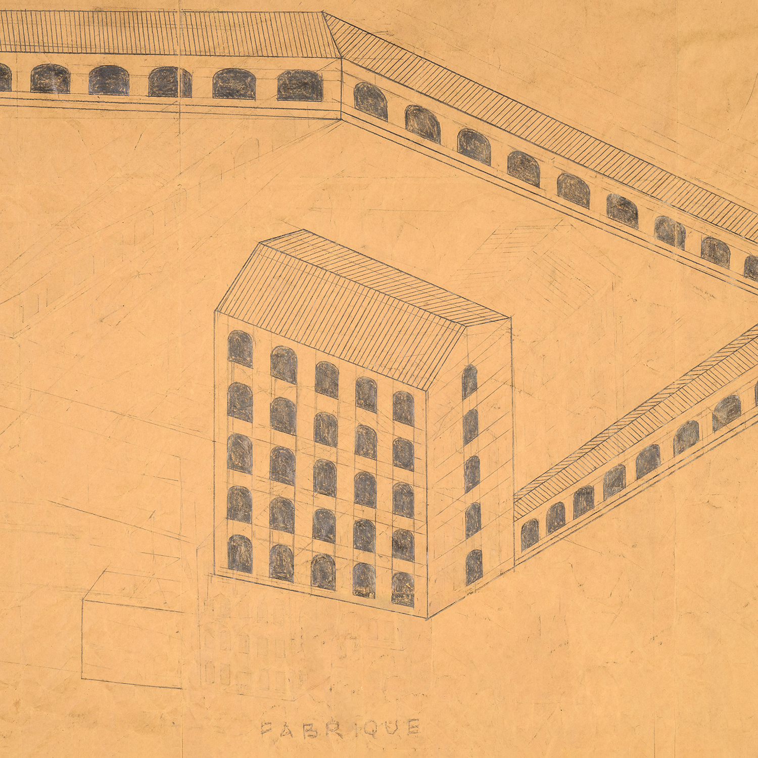 アーティストのフィリップ・ワイズベッカーの「建設」図面と建築表現は、彼が「偉大な産業革命の大聖堂」とみなす古い工場や一般的な建物に敬意を表しています。彼の図式的表現は、単純な構造の美しさと悲痛さの両方を捉えています。消し去られた鉛筆の線の薄れた跡は、時間の経過と彼のプロセスの試行錯誤を率直に伝えています。