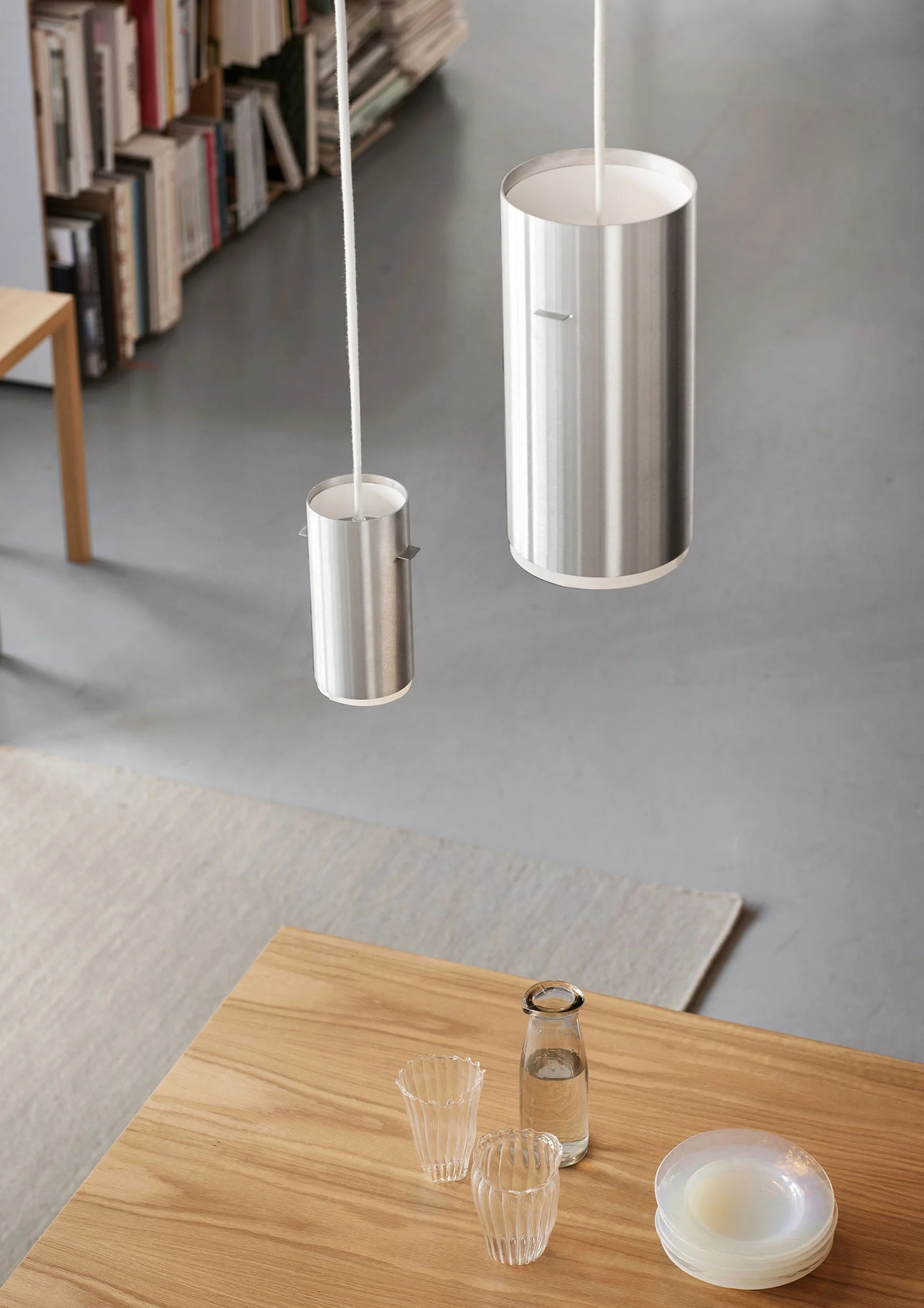 チューブペンダントは、シンプルな半透明の紙で裏打ちされたアルミチューブで構成されています。上部のシェードは簡単に調整でき、光が上向きに拡散します。また、下部の紙を延長してランプの端に柔らかく温かみのある光を与えることもできます。