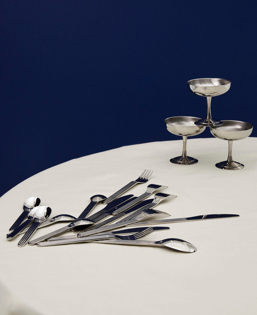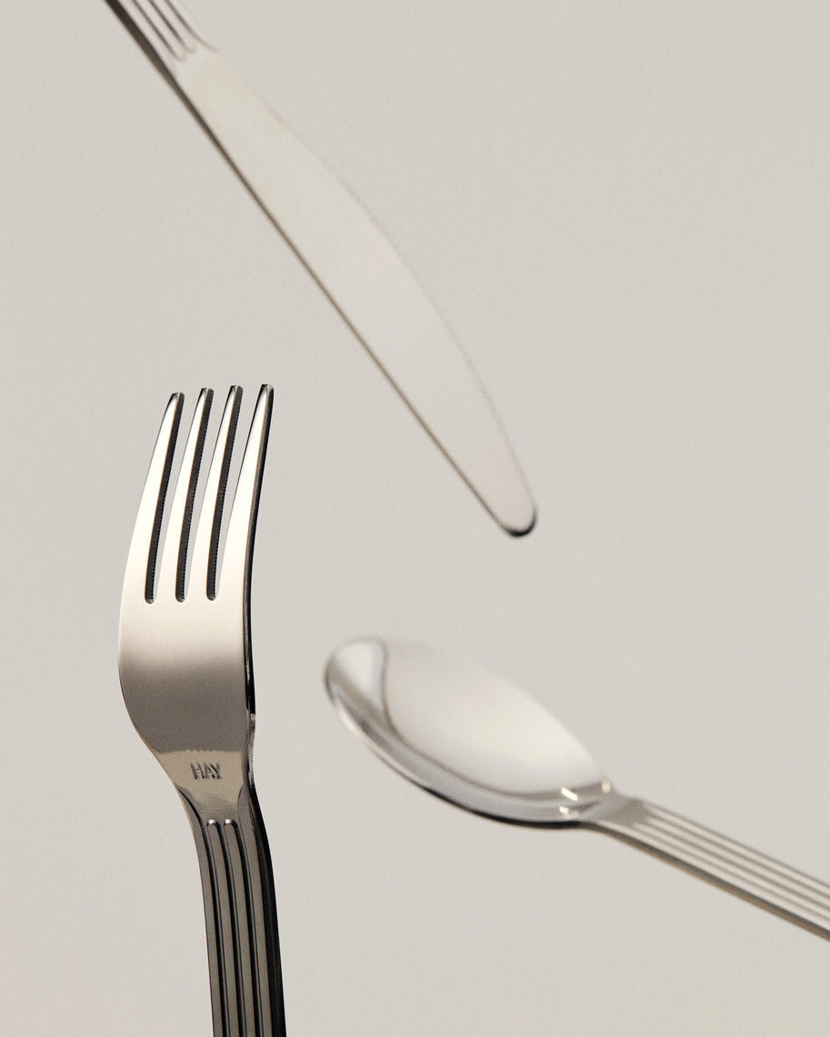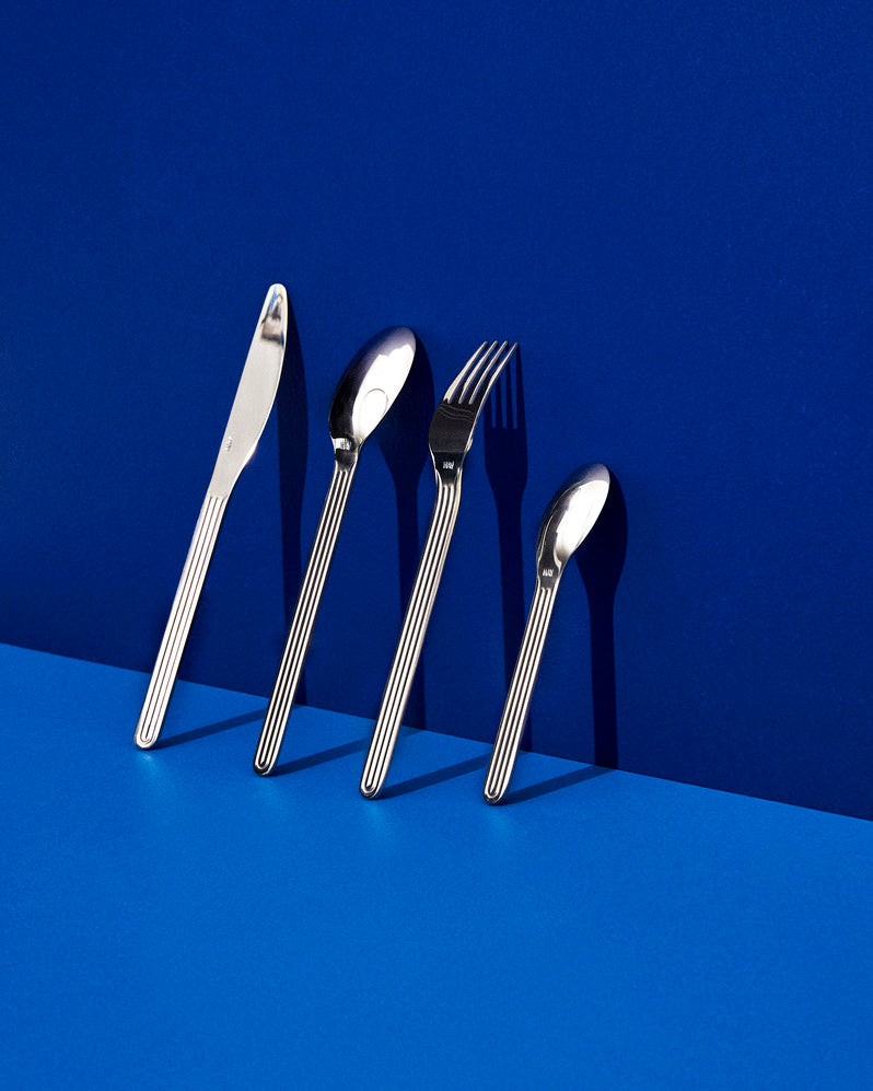 スイスのデザインスタジオ BIG-GAME がデザインした Sunday は、ナイフ、フォーク、デザートスプーン、ティースプーンからなる、溝付きハンドルを備えたカトラリー シリーズです。5 個セットです。