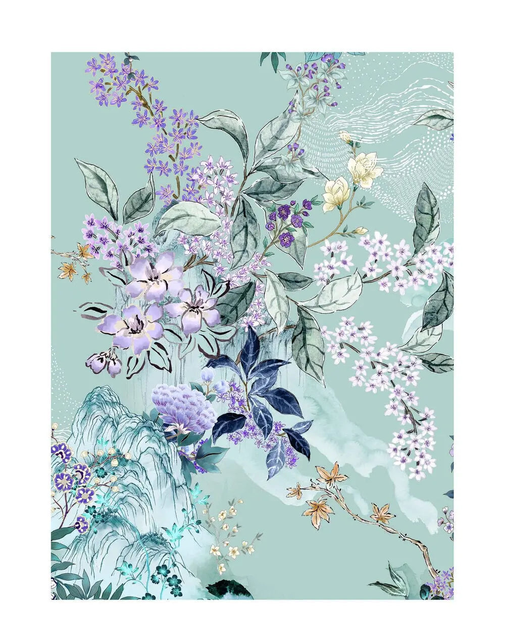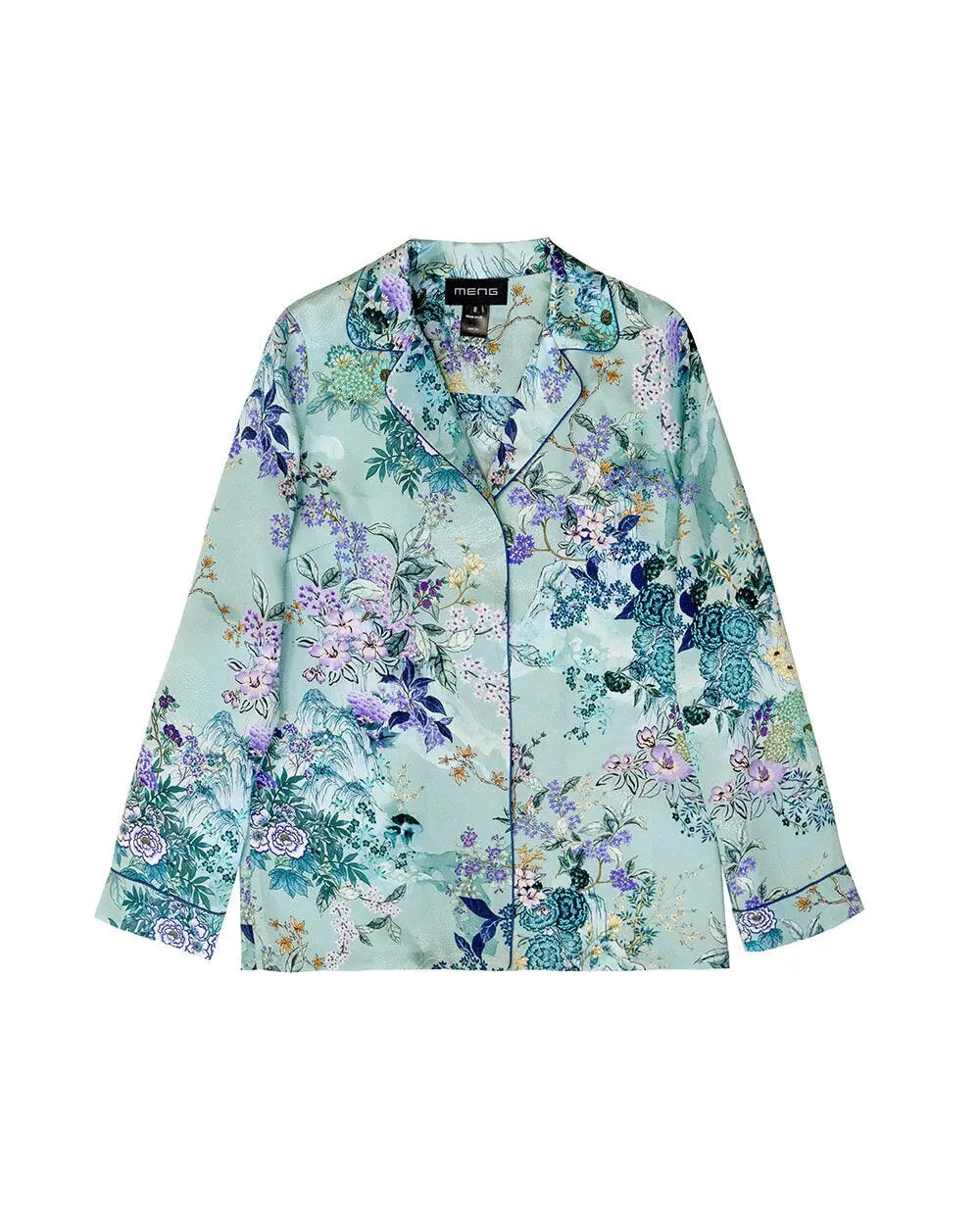 リラックスしたフィット感にカットされたこの 2 ピース パジャマ セットは軽量シルク製で、ライト グリーンの背景に繊細なマルチカラーの花柄プリントが特徴です。