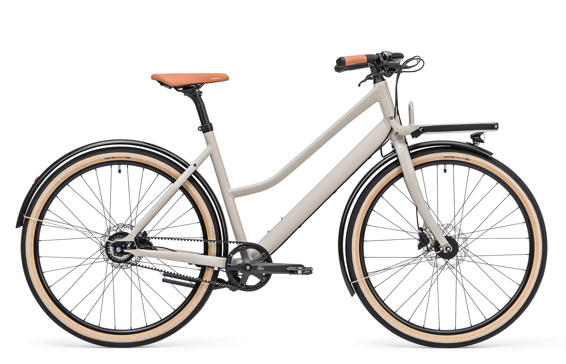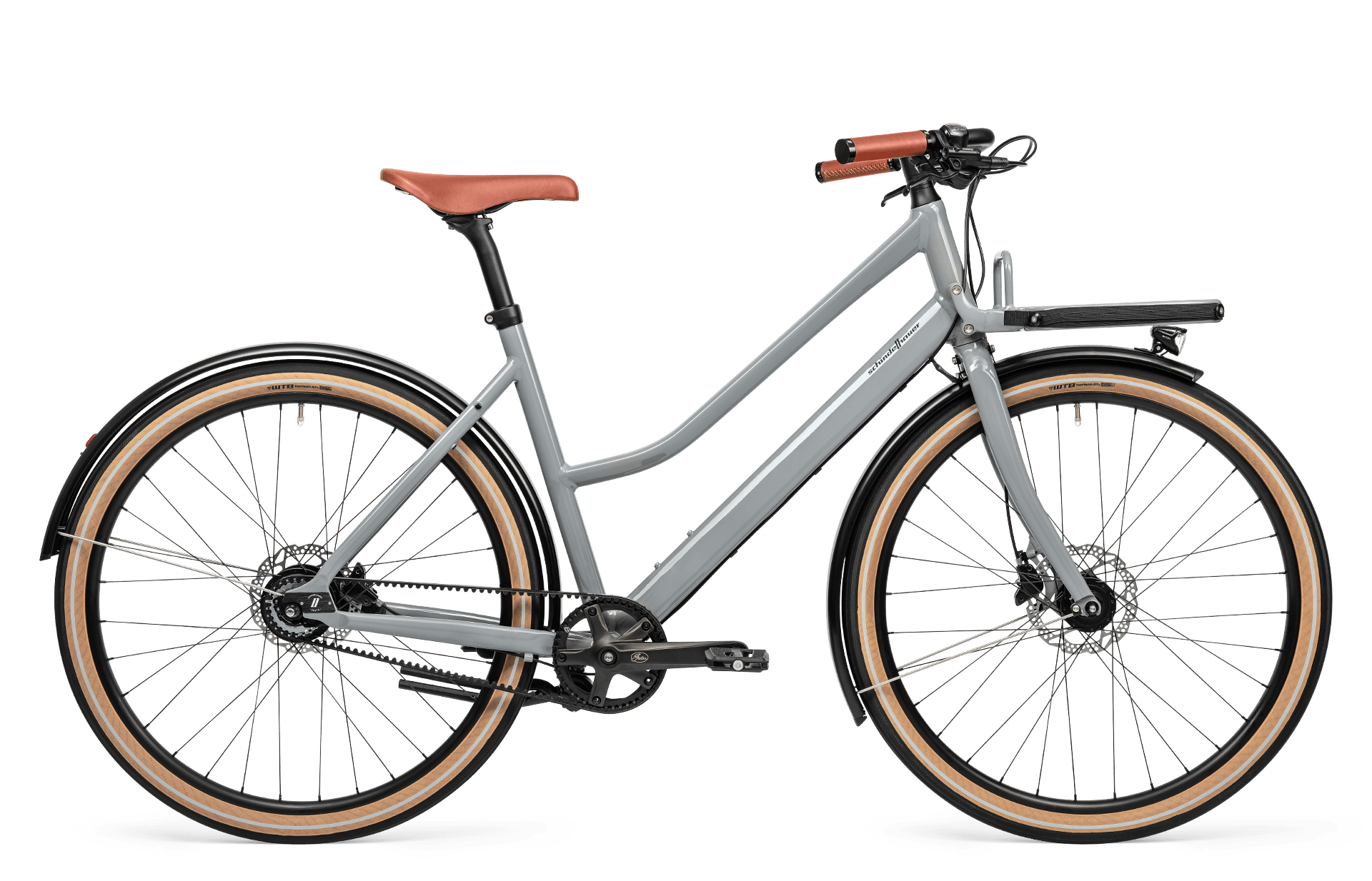 Schindelhauerのトレードマークは、機能性とミニマルなデザインを融合させた、まさに一目瞭然です。例えば、フェンダーに内蔵された照明システムや内装ケーブル配線などがその例です。注目すべきは、荷物をしっかりと固定するVarioStrapシステムを備えたフロントラックです。ラックはフレームに取り付けられているため、重い荷物を載せてもステアリングの邪魔になりません。Gretaはトップチューブが低いため、チャイルドシートを装着した状態での走行に最適で、乗り降りが簡単です。デュアルスタンドのおかげで、お子様や荷物を乗せても自転車が横に傾くことはありません。