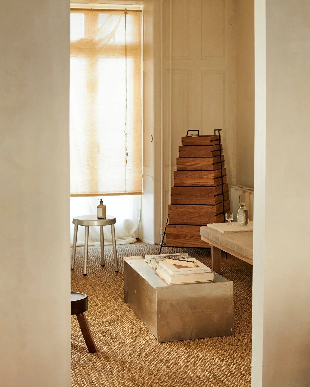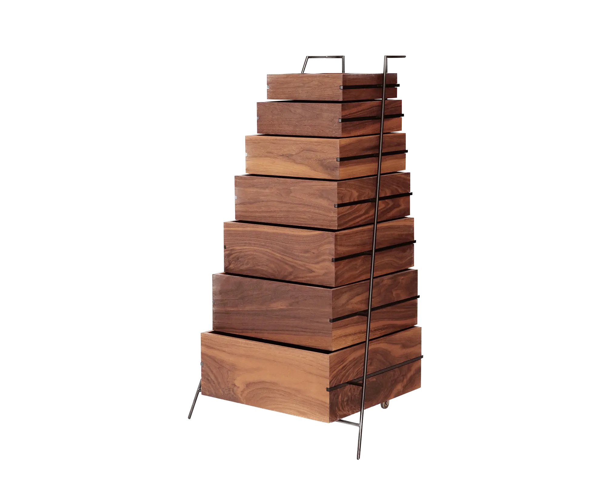 ハンドルとキャスターが付いたミニマルで移動しやすいスチールフレームと、積み重ね可能なオーク無垢材の引き出し 7 つを備えた Sutoa は、物を整理するために東京でデザインされた彫刻的な収納ソリューションです。このステートメントピースの名前は、日本語の「収納する」を意味する Sutoa に由来しています。