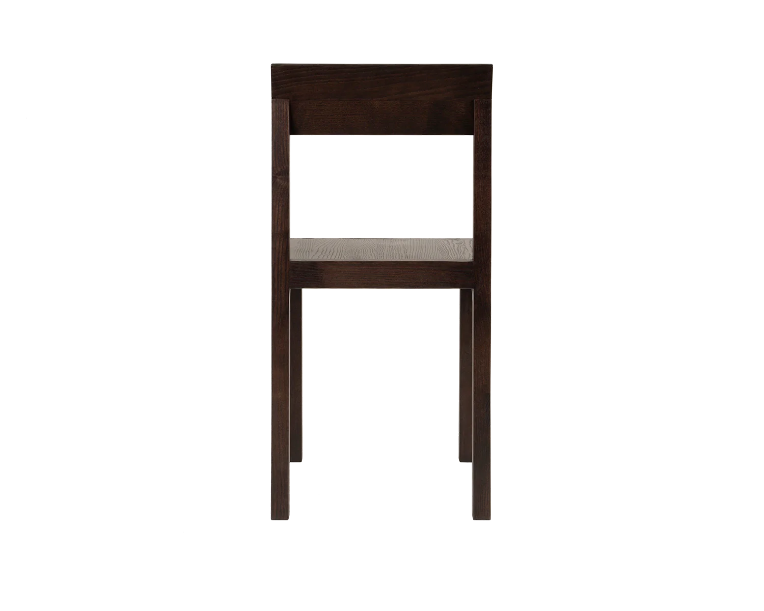 コペンハーゲンを拠点とするデザインスタジオ、フレデリック・グスタフとのコラボレーションによりデザインされたダークアッシュ材のブラケットチェアは、水性ラッカー仕上げのアッシュ無垢材を使用した4本脚の椅子です。フラットな座面とわずかに角度のついた背もたれは、構造部材であるブラケットによって強調されています。この純粋に機能的な要素は、椅子の垂直方向の要素と水平方向の要素を結びつけ、安定性をもたらす美しい特徴へと昇華されています。これは建築的な影響であり、時代を超越した構造へのオマージュです。