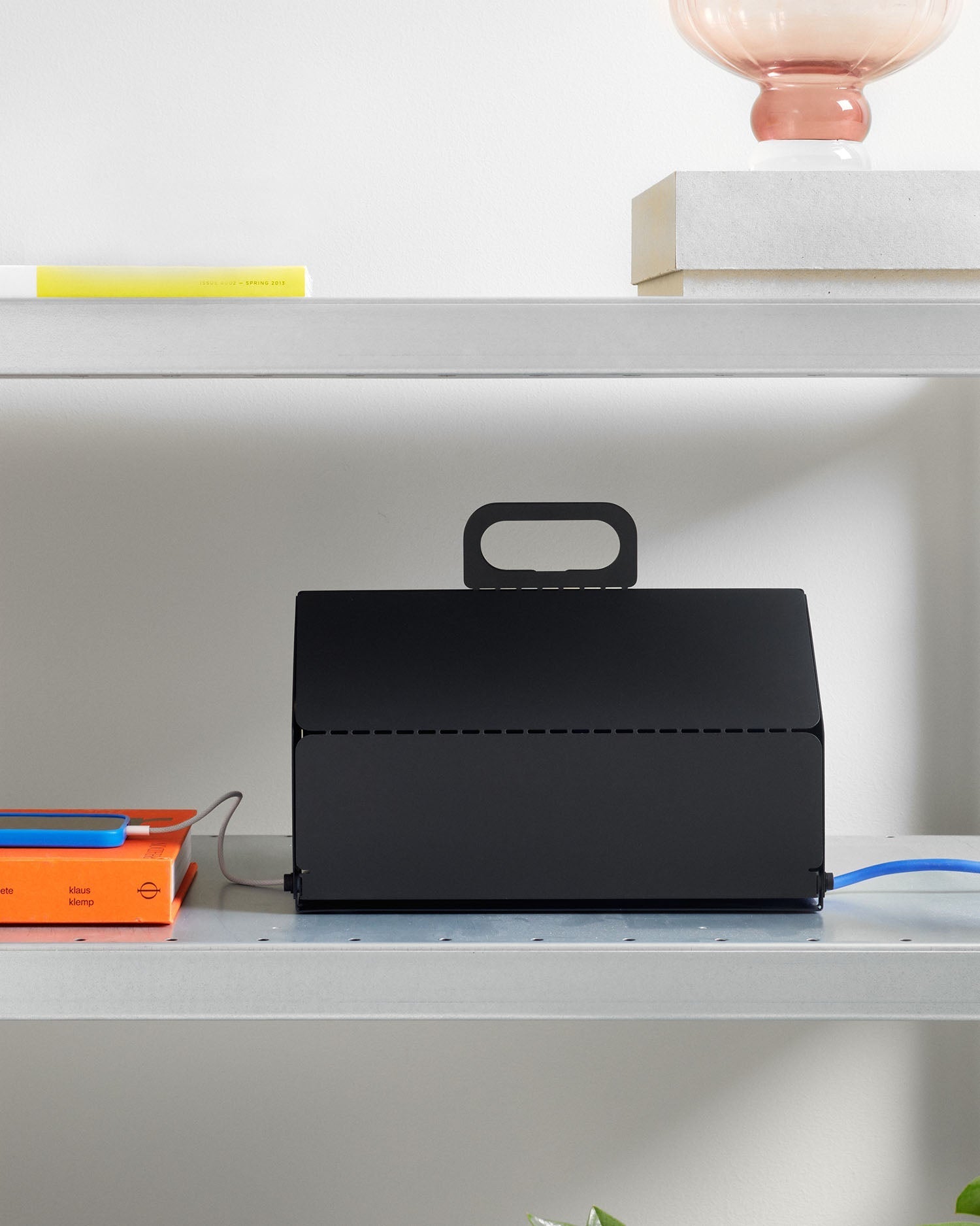 ケーブルが散らかるのも嫌ですよね?ケーブルハウスは、すっきりとしたデザインで、ケーブル、電源タップ、アクセサリーをすべてすっきりとまとめられます。ご家庭の電力分配器として最適です。専用ハンドルで簡単に移動できます。棚、床、机の上など、どこにでも置けます。ゴム足が付いているので、どんな場所にもしっかりと固定できます。ケーブルハウスは、チャコール、パール、ウルトラマリンの3色からお選びいただけます。