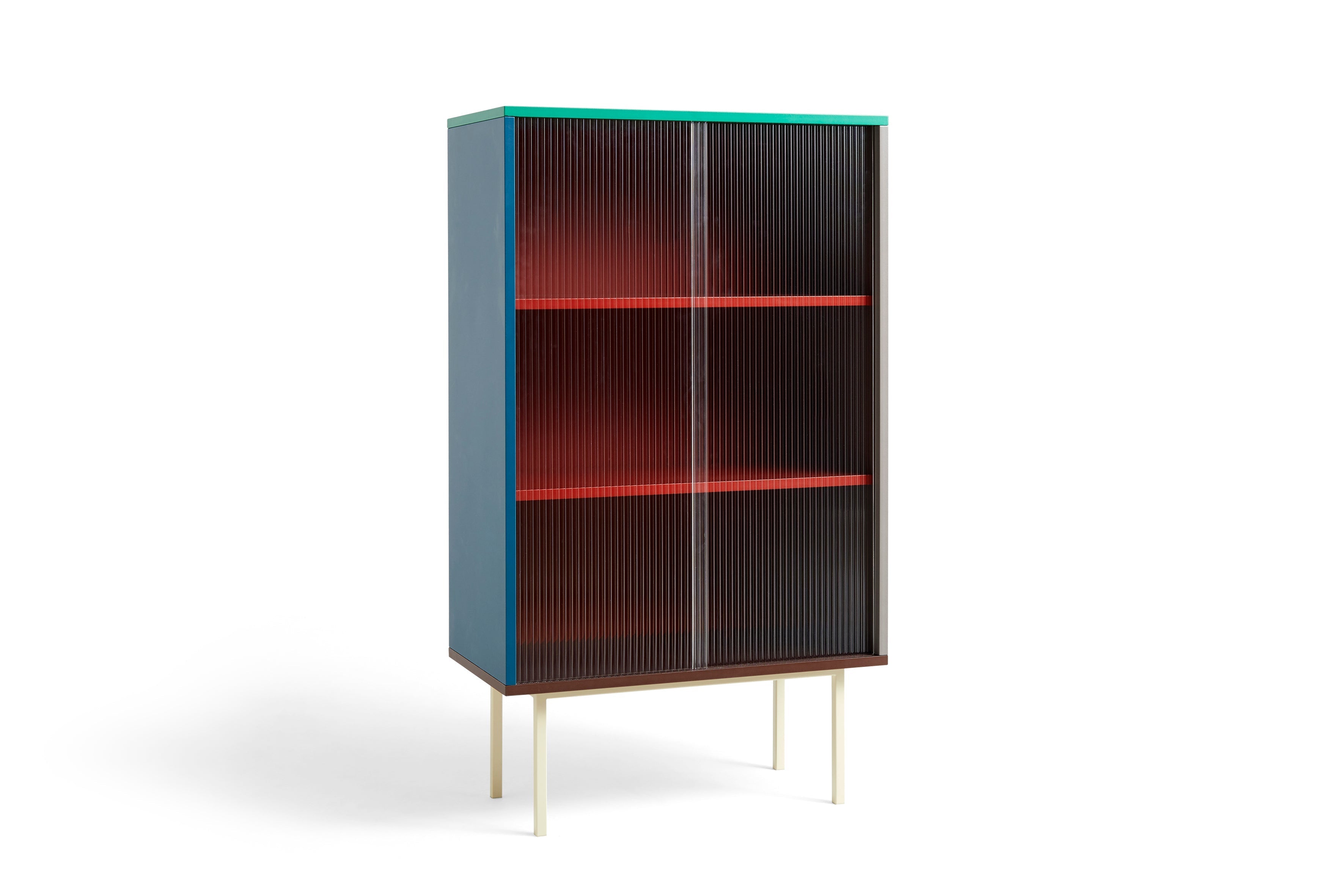 ベルギーのデザイナー、ミュラー・ヴァン・セーヴェレンがデザインしたカラー キャビネット コレクションは、床置き型と壁掛け型のキャビネットのシリーズで、すっきりとしたミニマリストなデザインと、色の鮮やかさと独創性との間の相反する相互作用を強調しています。