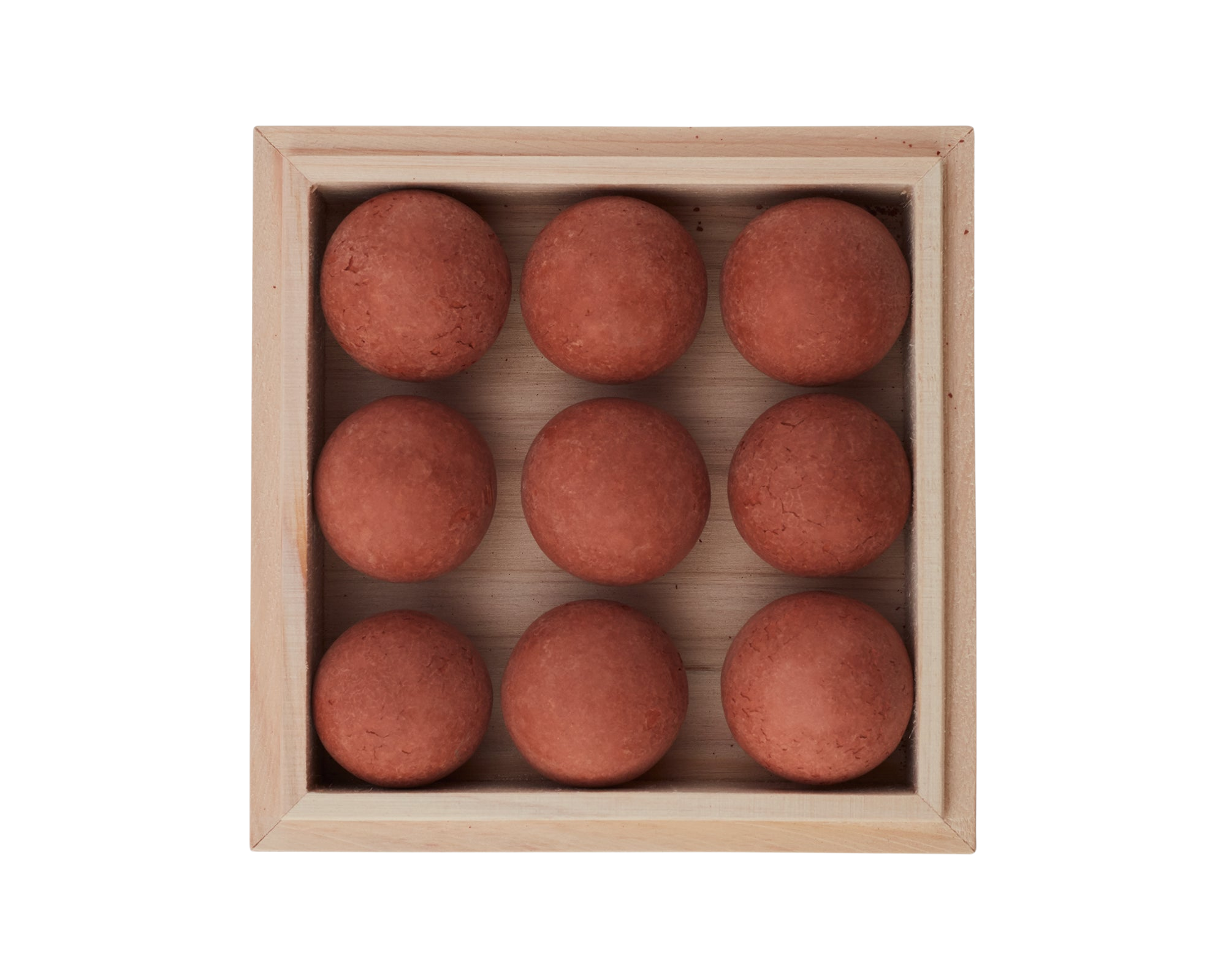 「From Soil to Form」は、韓国の土から作られた9つの赤い球体が入ったナチュラルなルームディフューザーです。松材の箱に収められた球体は、塗布したオイルの香りを優しく拡散し、空気を浄化し、部屋の湿度バランスを整えます。