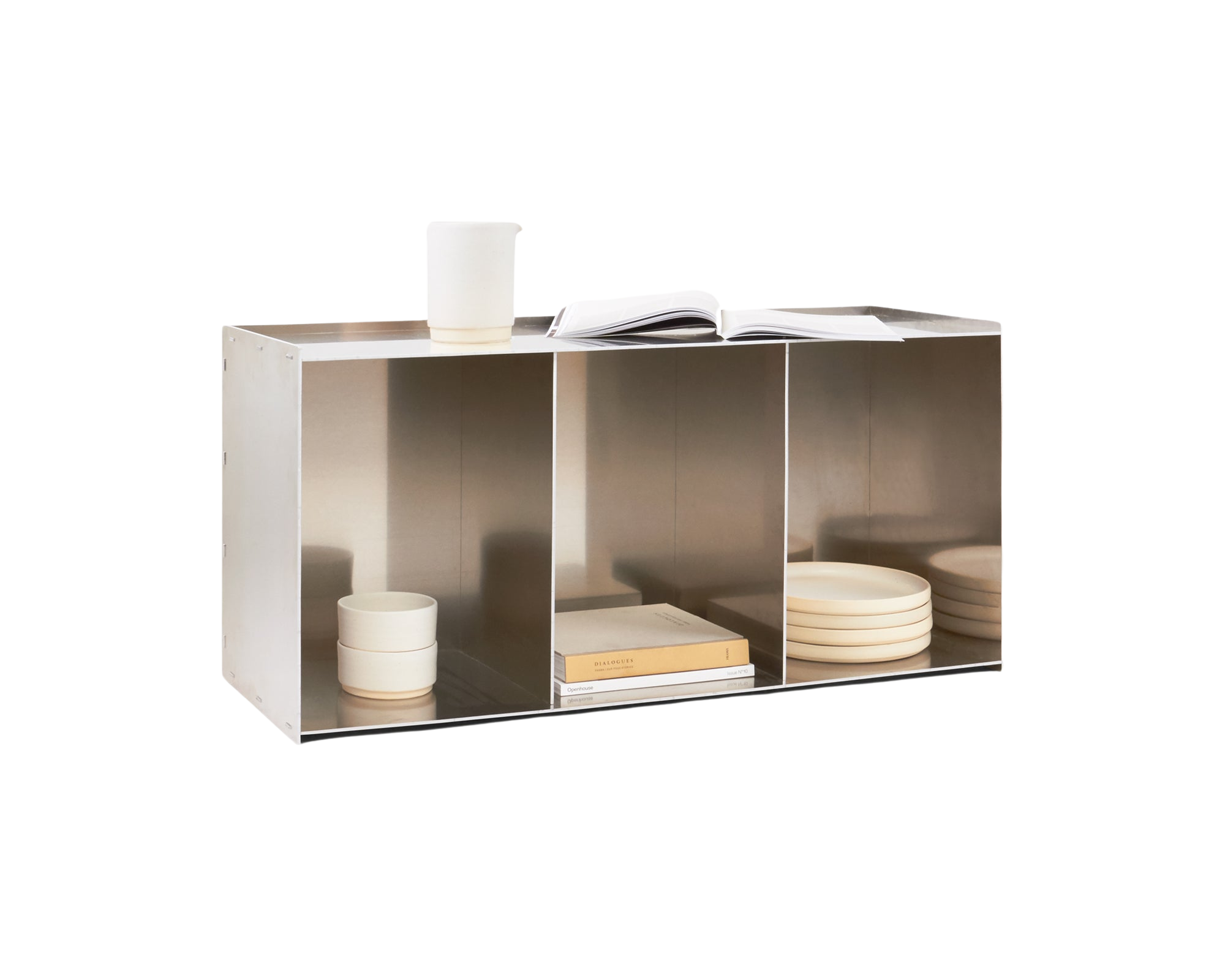 リベットケースは、その堅牢性と汎用性で人々を魅了します。縦置きにも横置きにもでき、テーブル、収納、ディスプレイルームとして機能します。レーザーカットされたアルミニウムの板材を垂直に接合するのに適したリベット技術をベースに、デザイナーのヨナス・トランペダッハが2011年に開発した冷間成形工程で、ハンマーを用いて手作業で組み立てられています。