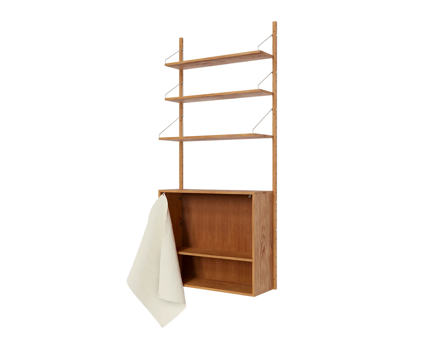 FRAMAの多用途なShelf Libraryシリーズの自然な流れとして、Shelf LibraryキャンバスキャビネットはShelf Libraryシステムにシームレスに統合されるように設計されています。重厚なキャンバス生地は扉と装飾パネルの役割を果たし、日本の伝統的な「暖簾」からインスピレーションを得ています。暖簾は、空間を仕切り、プライバシーを確保するために玄関や窓に掛けられる布製の仕切りです。キャンバスを使用することで、すっきりとしたミニマルな外観を実現すると同時に、散らかったものや物を隠す実用的なソリューションも提供します。