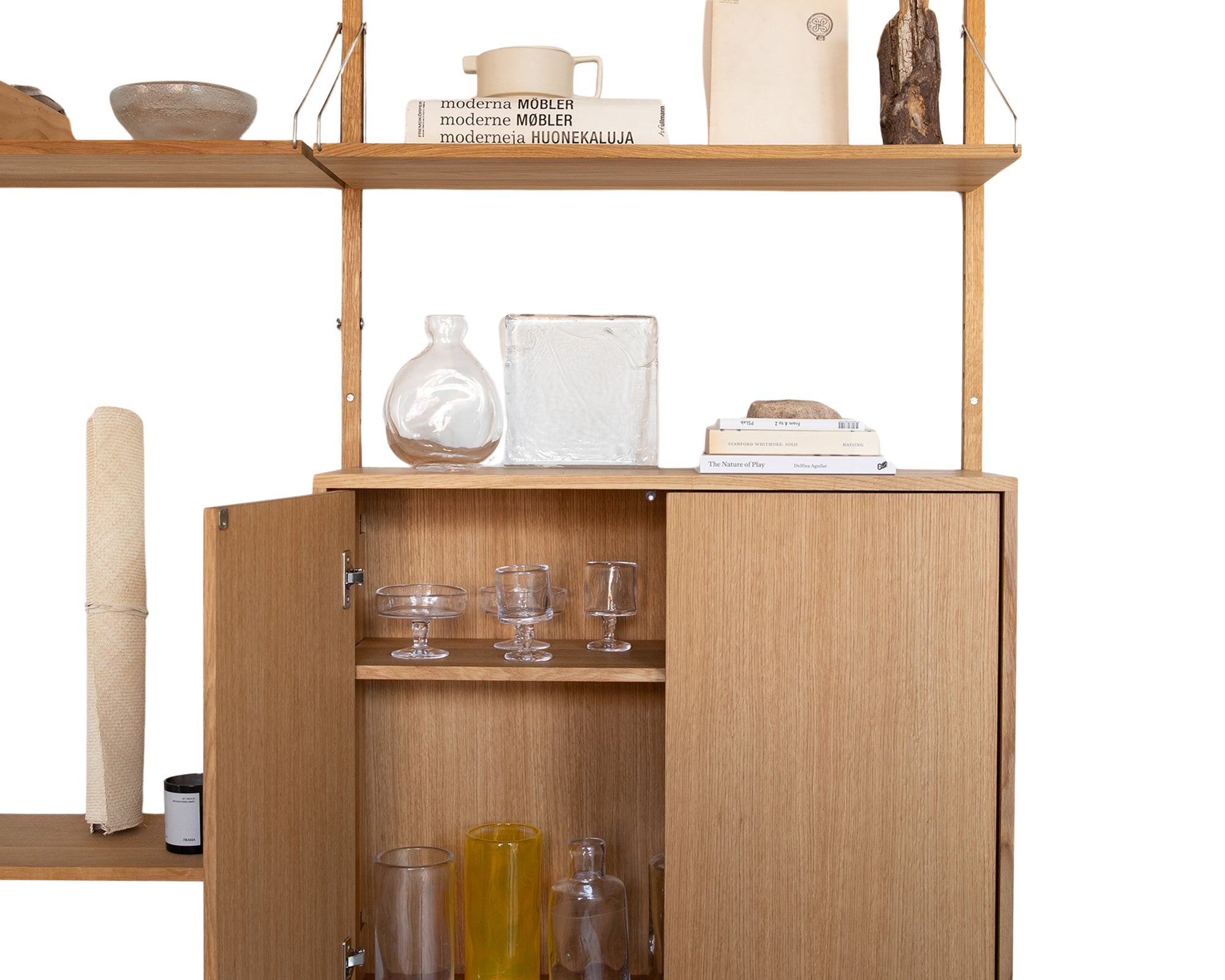 Framaの多用途なShelf Libraryシリーズの自然な延長として、Shelf Library CabinetはShelf Libraryシステムにシームレスに統合されるよう設計されています。オーク材のレールに頑丈なスチールネジを取り付けたモジュラー構成により、様々なスタイルに簡単にカスタマイズできます。