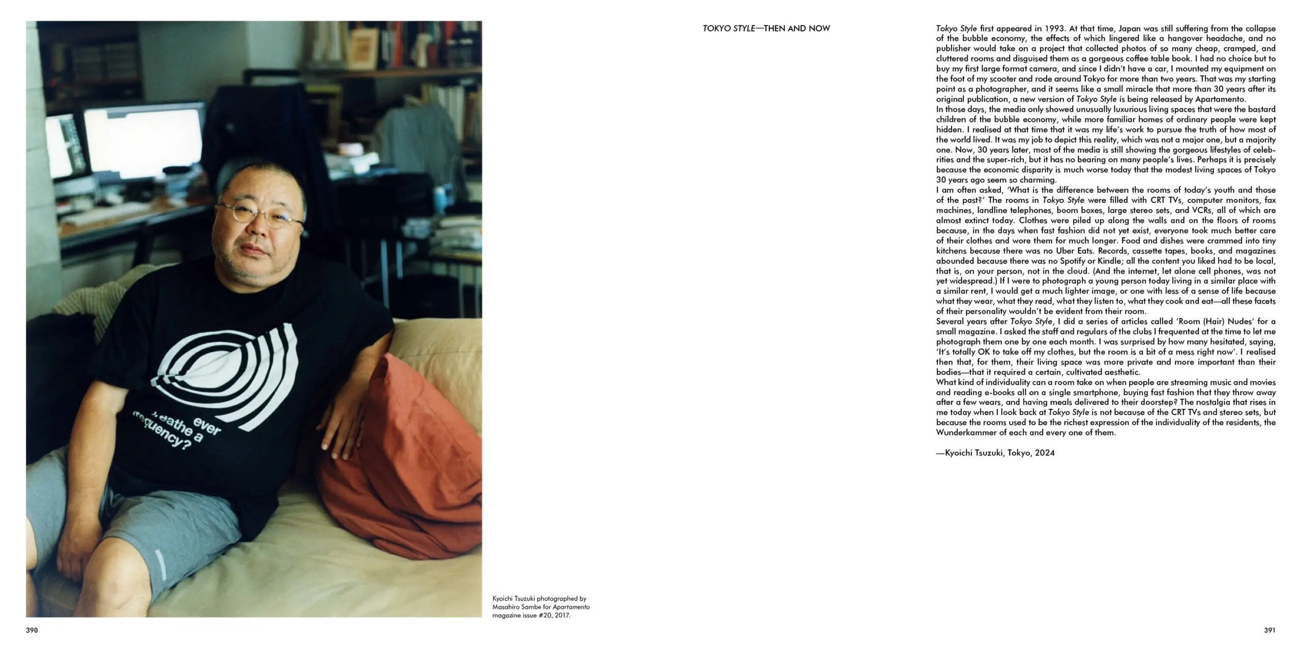 「仕方なく初めて大判カメラを購入し、車も持っていなかったため、機材をスクーターの足に載せて2年以上東京を走り回った。それが私の写真家としての原点であり、初版から30年以上経って、Apartamentoから新しいバージョンのTokyo Styleがリリースされるのは、小さな奇跡のように思えます。」—都築響一