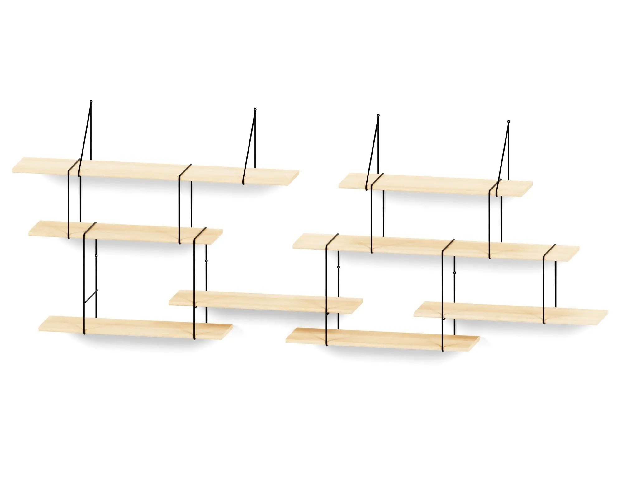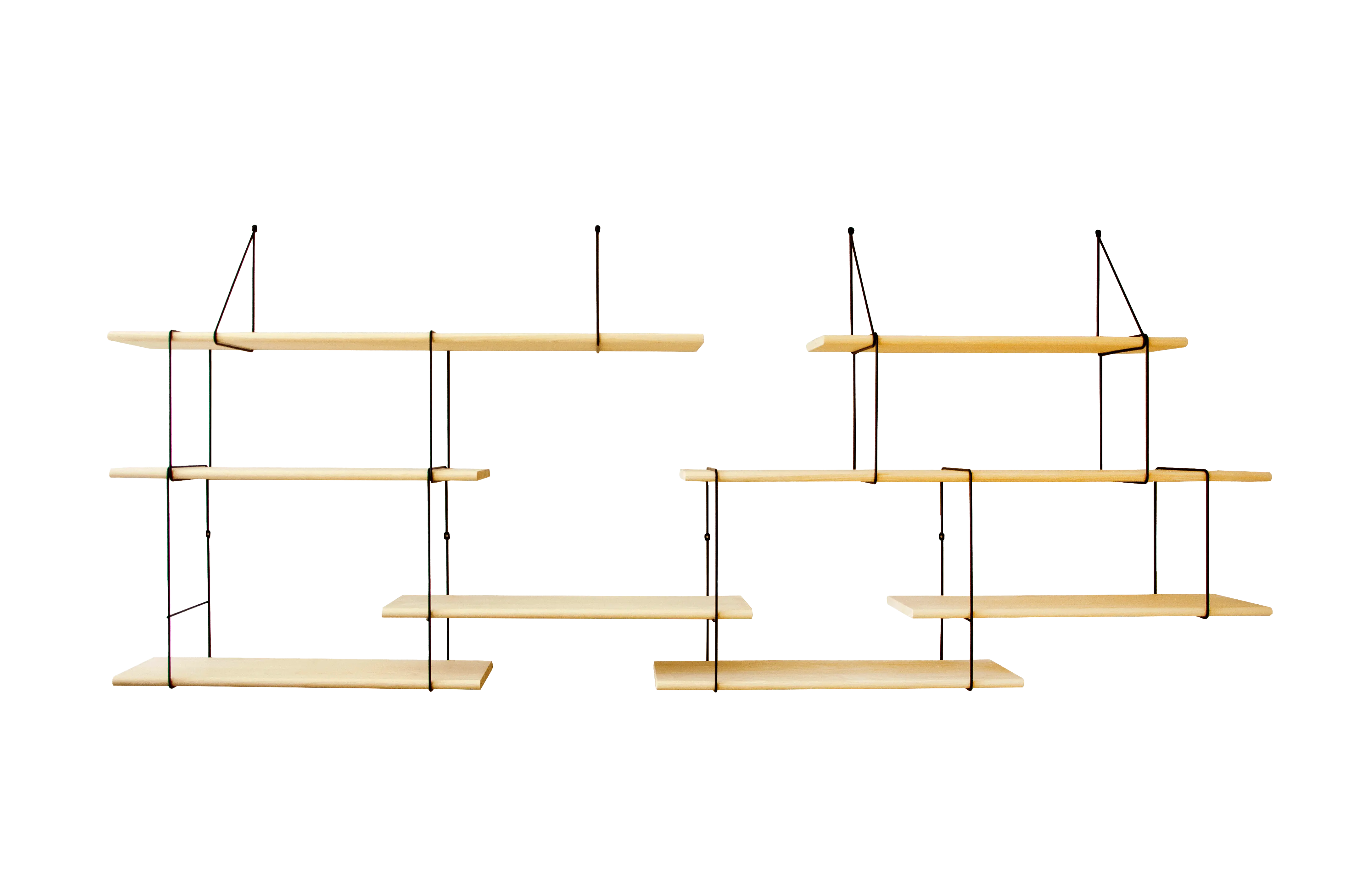 Several storage levels find their place here by cleverly working with asymmetry. They are connected with metal brackets and form an amazing floating whole, ready to house books and objects as the mood takes you.