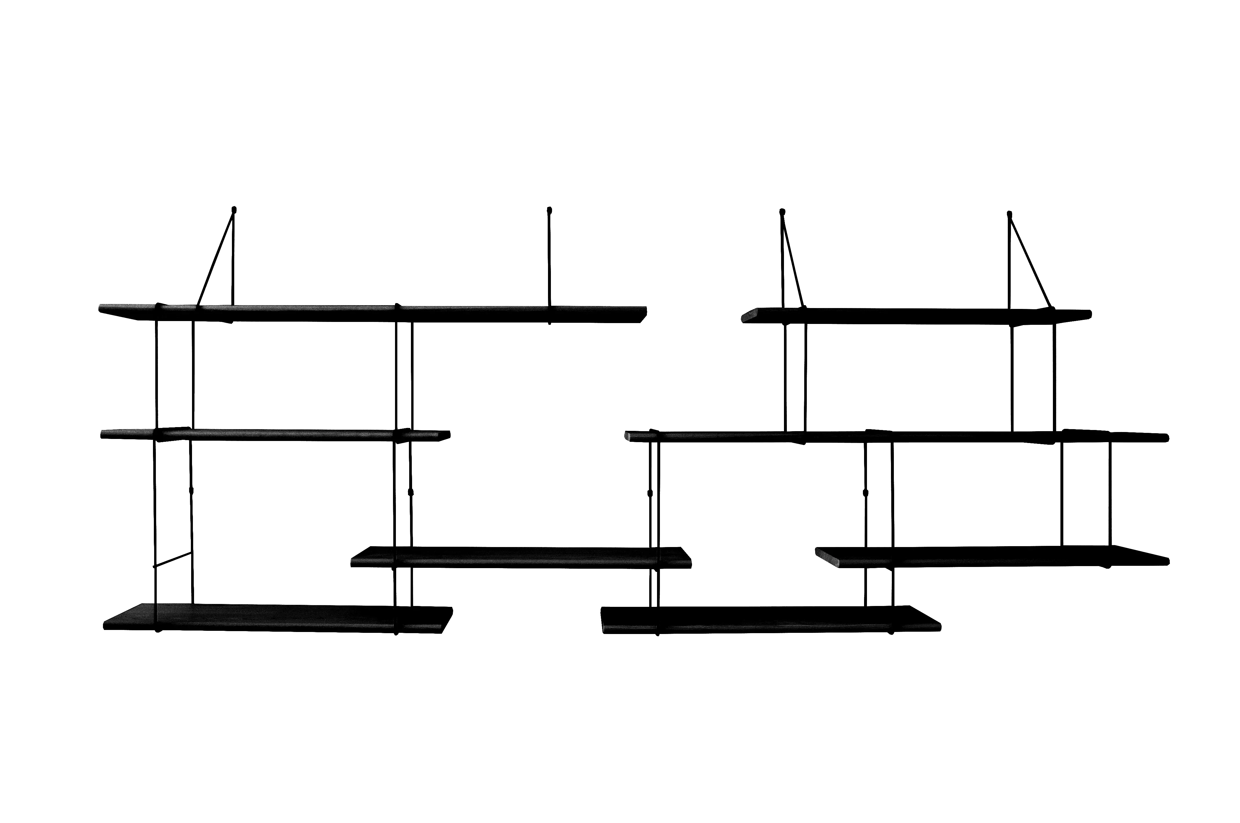 Several storage levels find their place here by cleverly working with asymmetry. They are connected with metal brackets and form an amazing floating whole, ready to house books and objects as the mood takes you.