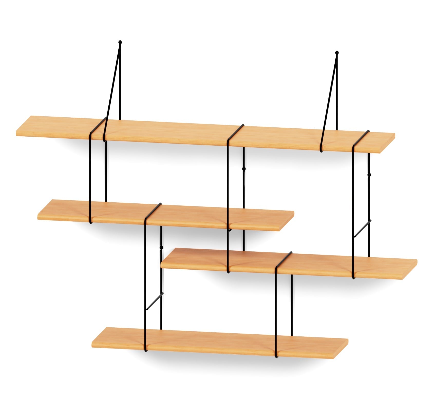 Several storage levels find their place here by cleverly working with asymmetry. They are connected with metal brackets and form an amazing floating whole, ready to house books and objects as the mood takes you.
