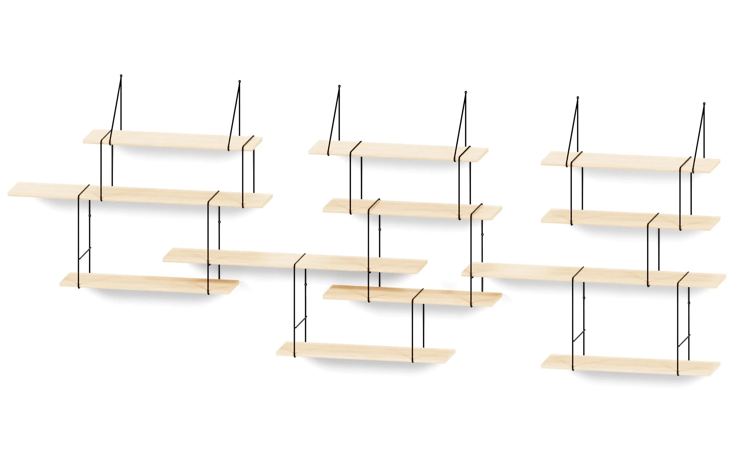 Several storage levels find their place here by cleverly working with asymmetry. They are connected with metal brackets and form an amazing floating whole, ready to house books and objects as the mood takes you.