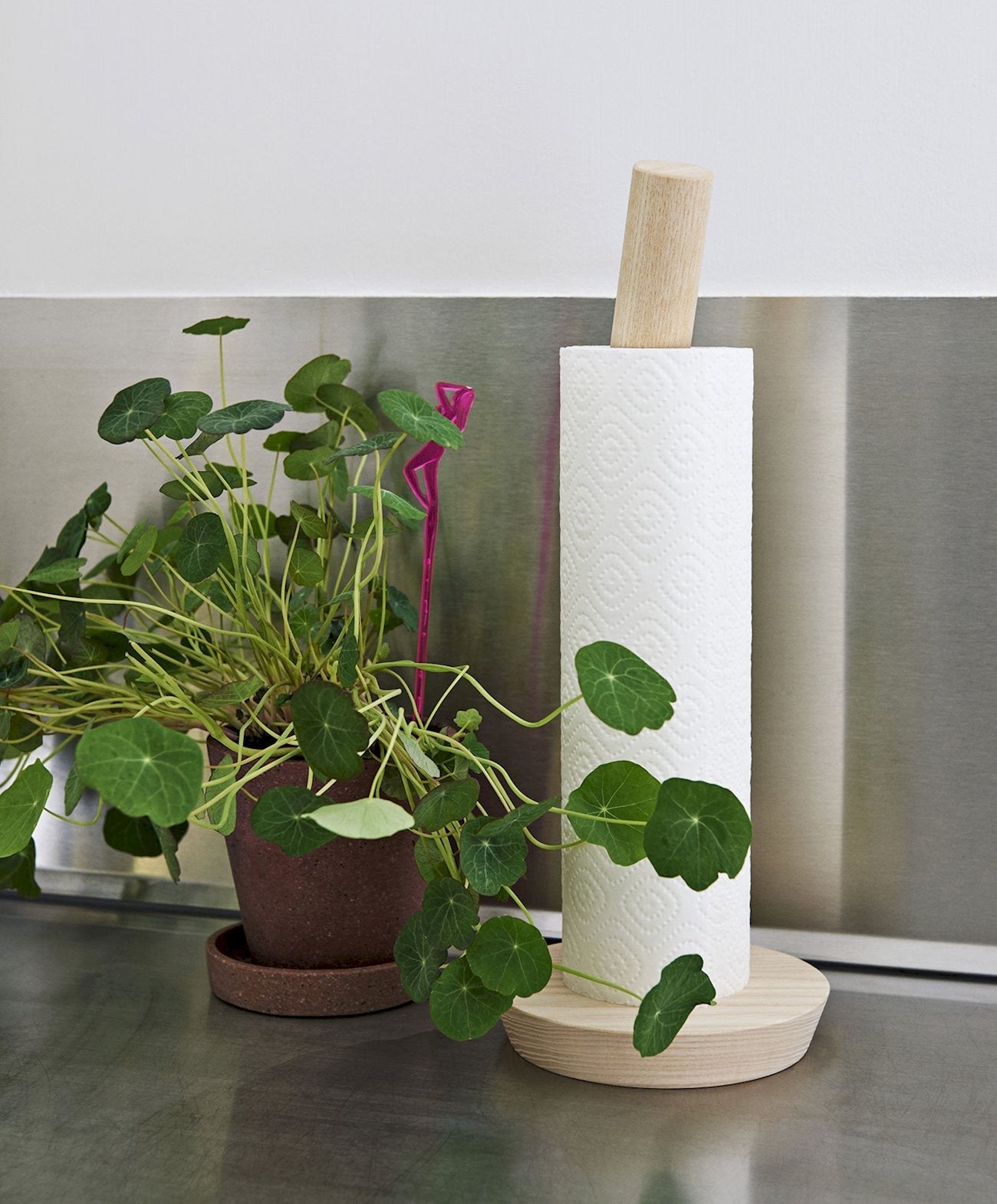 Designed for HAY by Shane Shneck, Porter is an ingenious wooden kitchen roll holder with a straight rod design that is locked into place by twisting the top section. Available in different wood variants.
